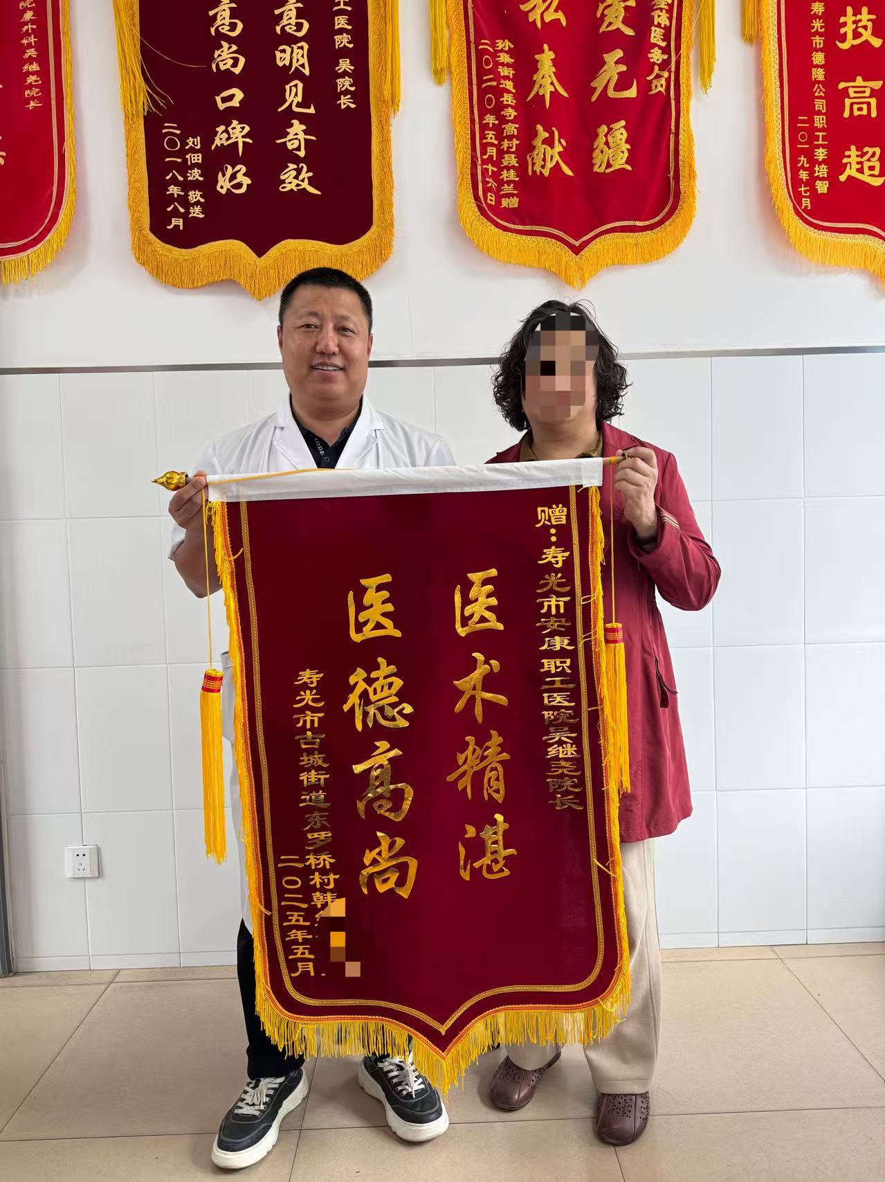 患者韩女士因腰椎间盘突出物较大压迫神经,导致下肢出现放射性疼痛及麻木症状持续二十多年。近年来,患者的病情呈进行性加重趋势。后慕名来到寿光市安康职工医院(寿光市颈肩腰腿痛诊疗中心)寻求治疗,经医院副院长吴继尧实施腰椎间盘低温等离子射频消融+盘内臭氧+盘外胶原酶溶解术治疗后,患者的下肢神经压迫症状得到有效缓解,疼痛麻木等不适感基本消失。为表达对吴继尧副院长精湛医术的认可和对医疗团队的感激之情,韩女士特意赠送来锦旗以致谢意。